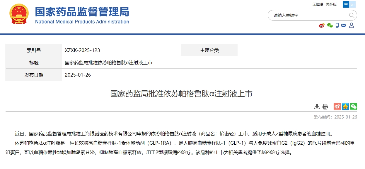2025年1月26日,國家藥品監督管理局(NMPA)批準了銀諾醫藥自主研發的怡諾輕®(依蘇帕格魯肽α注射液)在中國的上市申請,用于成人2型糖尿病(T2D)治療。這是全球新一代人源超長效GLP-1藥物!它有望開啟中國代謝健康治療的新篇章,幫助糖尿病患者更快地降低血糖,有望改善代謝,存在潛在的減重和心血管獲益,無需滴定,使用便捷。